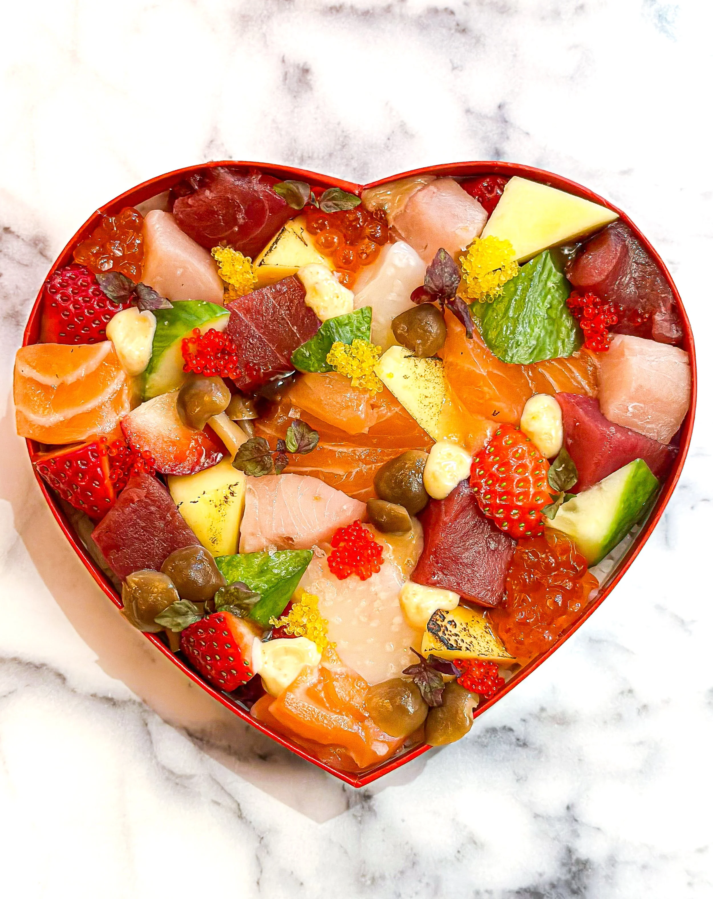 Maguro · Sake · Raspberry · Tsukemono · Mehijiki Salad · Avocado · Crispy Shallot · Sushi Rice